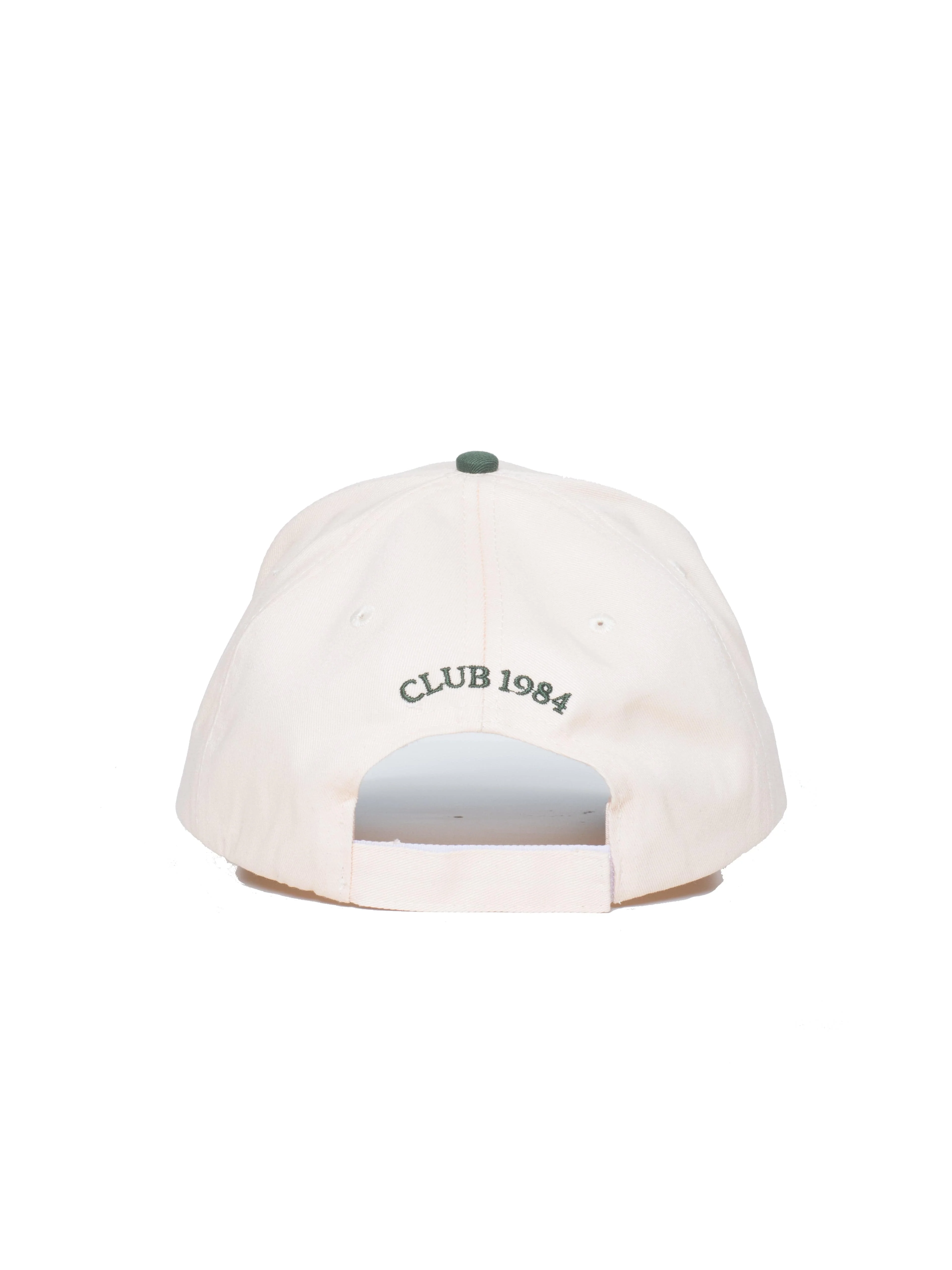 Club 1984 Championship Cap in Off White with adjustable sizing velcro strap, Green & Gold text to the front in embroidery.