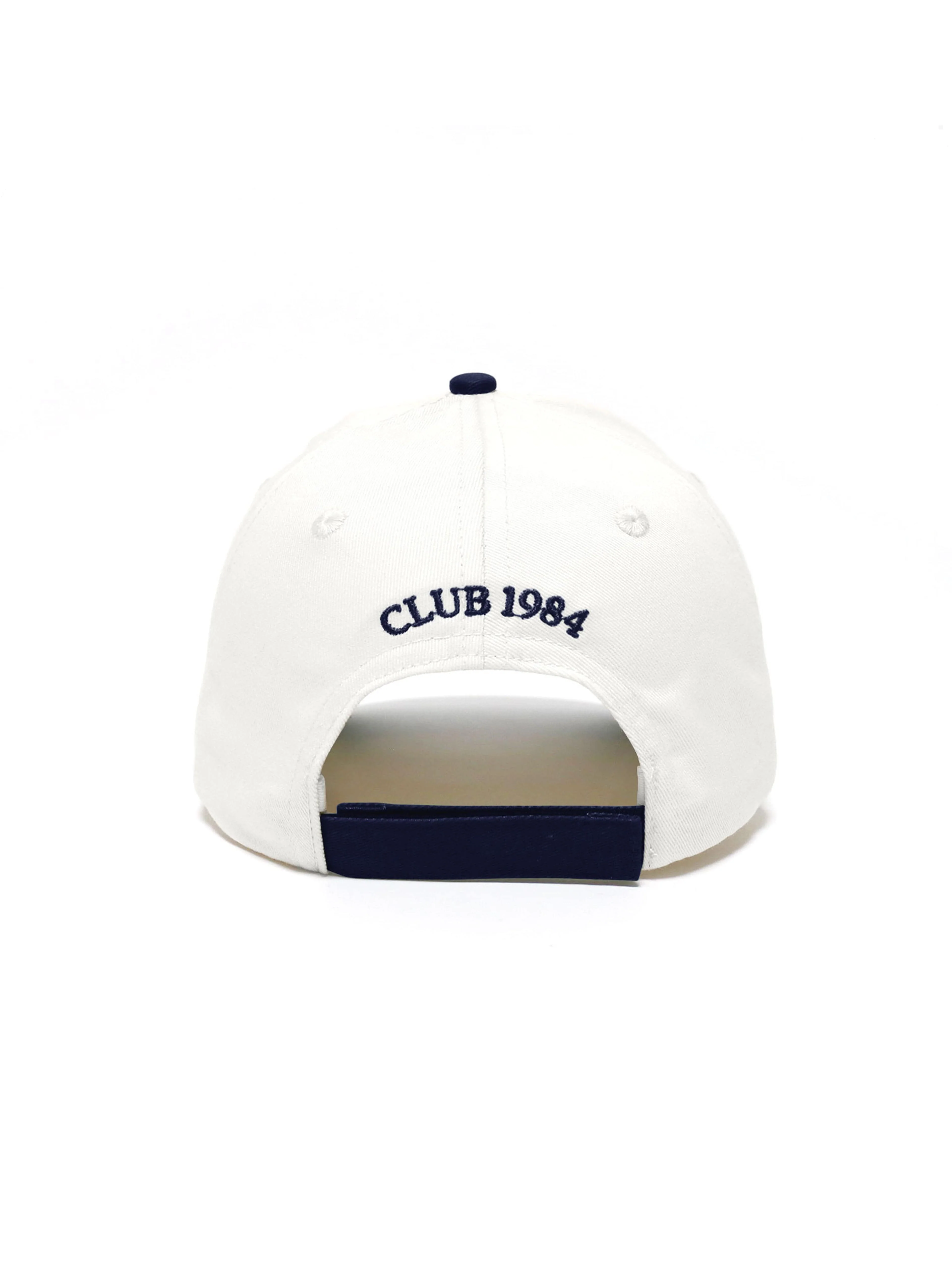 Club 1984 Championship Cap in Off White with adjustable sizing velcro strap, Navy & Gold text to the front in embroidery.